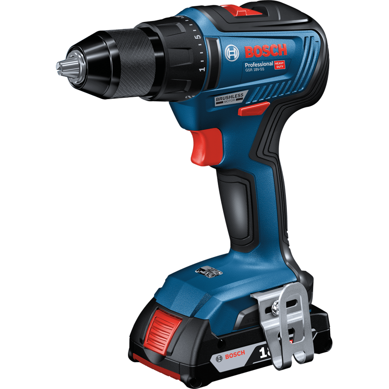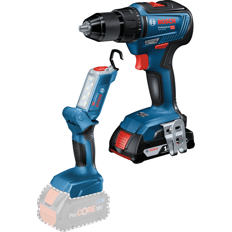 Akku-Bohrschrauber GSR 18V-55. Leistungsstarker 18V-Bohrschrauber der Einstiegsklasse mit bürstenlosem Motor von Bosch. Robust und leistungsstark: Großes Leistungspotenzial von 55 Nm und 1.750 min-1 für höchste Effizienz beim Arbeiten in Holz und Metall. Robustes 13-mm-Metallbohrfutter von Roehm für ideale Kraftübertragung beim Bohren und Schrauben. Mit bürstenlosem Motor für längere Werkzeuglebensdauer und höhere Akkulaufleistung. Im Lieferumfang enthalten: 2x Li-Ion Akku 18V 3.0Ah, Ladegerät, Lampe GLI 18V-300, L-BOXX