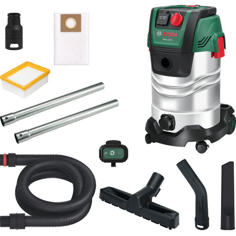 Allzwecksauger PAS30-240PRS. Meistere jede Reinigungsherausforderung: ultimative Leistung für Haus, Werkstatt und Garage. 1.300-W-Motor mit 240 mbar Saugleistung: entfernt mühelos nassen und trockenen Schmutz. Gleichbleibend hohe Saugleistung: dank halbautomatischer Filterreinigungsfunktion. UniversalAdapter: für den einfache Verbindung mit Elektrowerkzeugen über Autostart oder Bluetooth. Flachfaltenfilter: für Nass- und Trockensaugen ohne Filterwechsel. Blasfunktion entfernt Schmutz an schwer erreichbaren Stellen. Leichte, stabile Bewegung: mit 30-l-Behälter und kippsicheren Rädern. 2 x extension metal pipes (2 608 001 216). Suction hose 2.2 m (2 608 001 214). Elbow pipe (2 608 001 210). Floor nozzle (2 608 001 211). Crevice nozzle (2 608 001 209). Fleece bag PAS30-240PRS (2 608 001 221). Flat folded filter (2 608 001 220). Universal adapter (2 608 001 215). Kartonschachtel