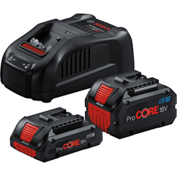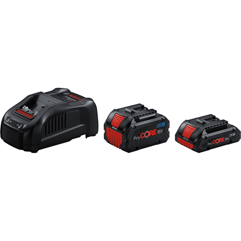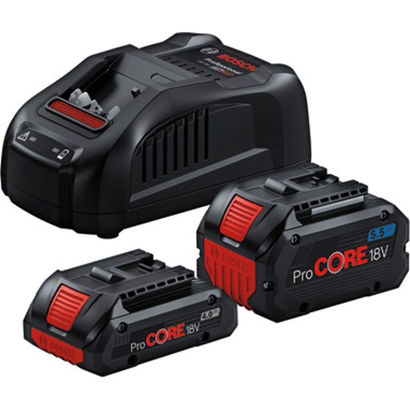 Starter-Set 1 x ProCORE18V 4.0Ah + 1 x ProCORE18V 5.5Ah + GAL 1880 CV, Der kraftvolle ProCORE18V 5.5Ah für Leistung wie bei einem 2.000-W-Kabelgerät und der kompakte und leichte ProCORE18V 4.0Ah werden in diesem Starter-Set kombiniert. Dank unserer neuesten Zellentechnologie mit 21700-Zellen und dem intelligenten Akkumanagement von Bosch liefern die ProCORE18V-Akkus 87 % mehr Leistung als konventionelle Akkus. Für eine längere Lebensdauer und Laufzeit ist dieser Akku mit unserer COOLPACK 2.0-Technologie ausgestattet, die ein ausgezeichnetes Wärmemanagement bietet. Für eine schnelle Aufladezeit befindet sich das GAL 1880 CV im Set. Dieses Schnellladegerät braucht für eine Aufladung auf bis zu 80 % nur 32 Minuten beim ProCORE18V und 35 Minuten beim ProCORE18V 8.0Ah. Kompatibel mit allen Werkzeugen und Ladegeräten aus dem Bosch Professional 18V System und der AMPShare Alliance. Die Akkus ProCORE18V 4.0Ah und 5.5Ah sind mit einer hochauflösenden Ladezustandsanzeige mit 5 LEDs ausgestattet. 1 x Akku ProCORE18V 4.0Ah (1 600 A01 6GB). 1 x Akku ProCORE18V 5.5Ah (1 600 A02 149). Schnellladegerät GAL 1880 CV (1 600 A00 B8G). Karton