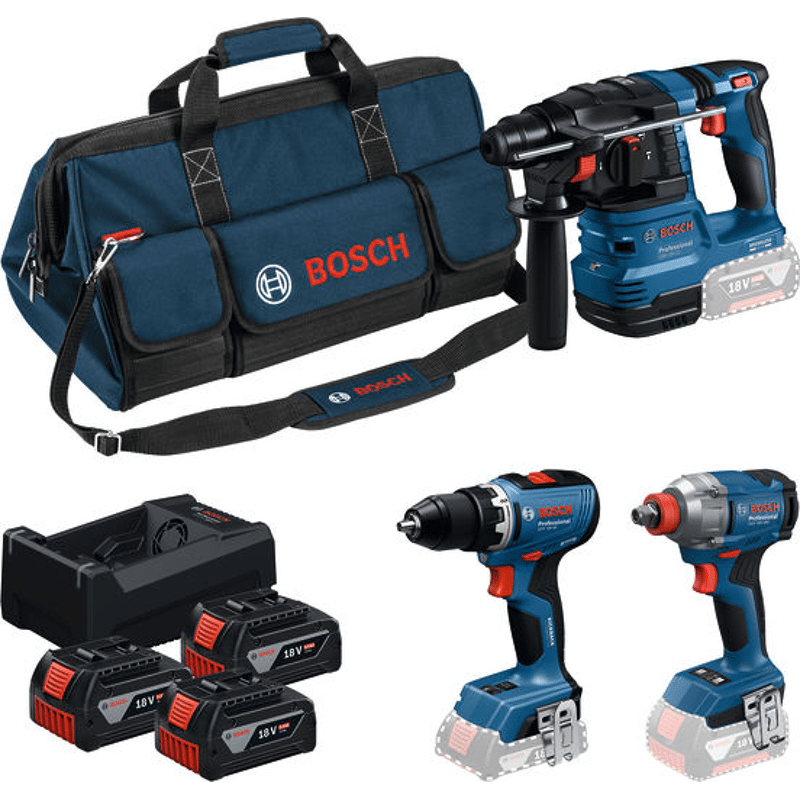 Combo Kit 18V-Set mit 3 Werkzeugen: GSR + GDX + GBH + 3x5.0Ah + GAL 12V/18V-80. Eine perfekte Kombination von Profi-Elektrowerkzeugen, um die Arbeit effizient zu erledigen. 3 x Akku GBA 18V 5.0Ah (1 600 A00 2U5). Bosch Professional Werkzeugtasche, Medium (1 600 A00 3BJ)