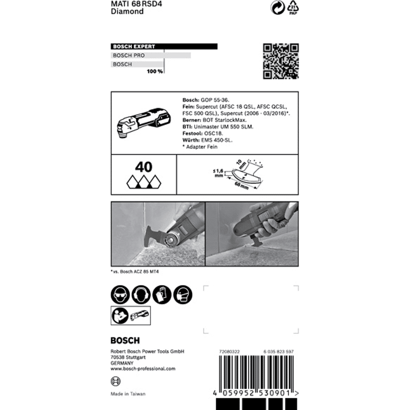 Hohe Lebensdauer in Fugenmörtel und weichen Fliesen! Spitzes Segmentsägeblatt für präzise Arbeiten bis in Ecken Das Entfernen der Fugenmasse zwischen den Fliesen ist eine Aufgabe, die Bad- und Kücheninstallateure regelmäßig durchführen müssen. Multifunktionswerkzeuge sind dafür ideal geeignet, aber manchmal ist es schwierig, in die Ecken oder um Armaturen herum zu gelangen. Mit dem EXPERT Corner Blade Blatt ist dies kein Problem. Es bietet nicht nur eine lange Lebensdauer und schnelle Entfernung des Mörtels, sondern erreicht auch problemlos Ecken. Das Bosch EXPERT Corner Blade für Multifunktionswerkzeuge ist das perfekte Zubehör für Fliesenleger und Bad- oder Kücheninstallateure. Aufgrund seiner extrem langen Lebensdauer und Vielseitigkeit sollte es in deinem Werkzeugkasten ganz oben liegen. Außergewöhnlich robuste Schneidekante mit Bosch Diamond Technology