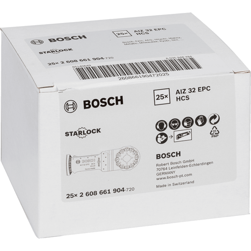 Das Tauchsägeblatt Starlock AIZ 32 EPC ermöglicht präzise Schnitte in Holz. Seine abgerundete Blattspitze (Curved-Tec) ermöglicht präzise und glatte Tauchschnitte. Das robuste Starlock-Aufnahmesystem reduziert Lateralschwingung und ermöglicht mittels direkter Kraftübertragung präzise Schnitte. Sein zur Basis verjüngtes Blatt minimiert Verklemmen und transportiert Späne schneller ab. Dieses Produkt wird verwendet für das Tauchsägen in Weichholz, das Sägen von Aussparungen in Möbelbauteile und das bündige Ablängen von Holzbauteilen. Das Starlock-Aufnahmesystem ermöglicht einen schnellen Blattwechsel ohne Blattberührung in drei Sekunden. Das Aufnahmesystem ermöglicht durch seine dreidimensionale enge Passung maximale Kraftübertragung zwischen Maschine und Zubehör.