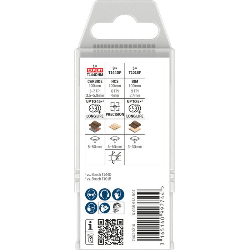 Das 15-teilige Stichsägeblatt-Pack für Holz deckt alle Anforderungen für den Einsatz in Holzmaterialien ab. In den fünf Schlitzen sind die Stichsägeblätter sicher und fest verstaut. Dies ermöglicht einen schnellen und einfachen Zugang und eine komfortable Handhabung bei der Arbeit. Es bietet ein Sortiment an Blättern, das speziell für eine Vielzahl an Anwendungen in Holz geeignet sind. Zudem enthält es ein Musterblatt, das mit der einzigartigen, hochmodernen Carbide-Technologie von Bosch hergestellt wurde. Das kompakte Design des Packs ermöglicht eine komfortable Aufbewahrung direkt im Werkzeugkasten. So behalten Sie den Überblick, können einfach darauf zugreifen und es sicher transportieren.