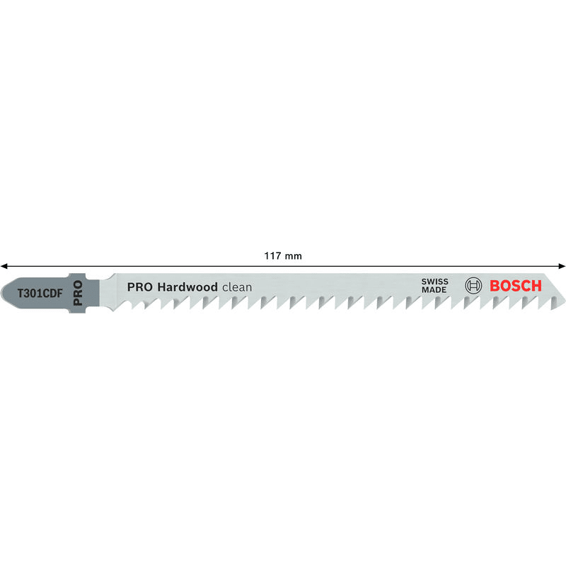 Herausragende Lebensdauer in Hartholz! Bi-Metall Blatt: Kombiniert harte Zähne mit flexiblem Blattkörper Bist du Tischler und auf der Suche nach einem Stichsägeblatt zum Schneiden dickerer Werkstücke aus Hartholz? Ein Stichsägeblatt, das gerade, saubere Schnitte liefert? Mit dem PRO Hardwood clean T301CDF kannst du diese Arbeit erledigen. Das PRO Hardwood clean T301CDF Stichsägeblatt wurde aus BI-Metall hergestellt: Es verfügt über eine Zahnleiste aus Schnellarbeitsstahl (HSS), die mit einem Körper aus Kohlenstoffstahl (HCS) verbunden ist, um sicherzustellen, dass du Hartholz und abrasive Holzwerkstoffe problemlos bearbeiten kannst. Das Blatt hat eine konische Form und eine mittere Zahnteilung für saubere Schnitte, ohne hängen zu bleiben. Dank der erweiterten Länge kannst du massives Hartholz mit einer Dicke zwischen 4 und 65 mm schneiden.