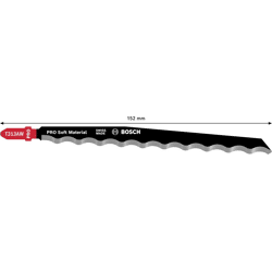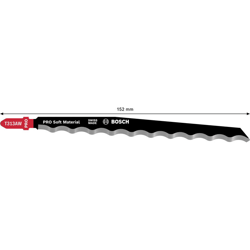 Präzises Schneiden weicher Materialien! Die gezahnte Messerkante sorgt für saubere Schnitte in weichen, nicht abrasiven Materialien Das Schneiden weicher Materialien wie Gummi, Pappe und Leder verlangt nach einem speziellen Stichsägeblatt. Mit seiner Wellenschliff-Schneide, die auf Schärfe und Präzision ausgelegt ist, bietet das PRO Soft Material T313AW alles, was du für die Erfüllung deiner Arbeit benötigst. Das PRO Soft Material T313AW Stichsägeblatt wurde aus Kohlenstoffstahl (HCS) hergestellt. Durch die Schnittkante mit Wellenschliff bleibt sie scharf und präzise, sodass du weiche, nicht abrasive Materialien problemlos schneiden kannst. Wir haben dieses Blatt lang gemacht, damit du Materialien mit einer Dicke von bis zu 100 mm bearbeiten kannst.