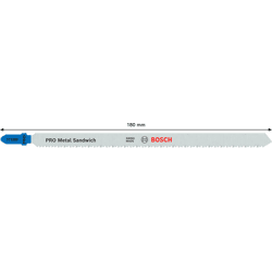 Herausragende Lebensdauer beim Schneiden von Metall-Sandwich! Bi-Metall Blatt: Kombiniert harte Zähne mit flexiblem Blattkörper Das Schneiden von Metall-Sandwich erfordert ein Stichsägeblatt, das nicht nur stark, sondern auch lang genug ist, um hartes, mehrschichtiges Material zu durchtrennen. Wie das langlebige PRO Metal Sandwich T718BF. Es hat eine Länge von 180 mm, damit du problemlos Metall-Sandwiches durchtrennen kannst – immer und immer wieder. Das PRO Metal Sandwich T718BF Stichsägeblatt ist eine gute Wahl für Bauarbeiter und Installateure, die ein langlebiges Stichsägeblatt zum Schneiden von Metall-Sandwich benötigen. Es verfügt über eine Zahnleiste aus Schnellarbeitsstahl (HSS) und einen elastischeren Körper aus Kohlenstoffstahl (HCS), um sicherzustellen, dass es beim Schneiden mehrschichtiger Platten nicht bricht. Die gefrästen, gewellten Zähne mit feiner Zahnteilung sind so konzipiert, dass du gerade Schnitte in Werkstücken mit einer Dicke von bis zu 120 mm erzielen kannst.