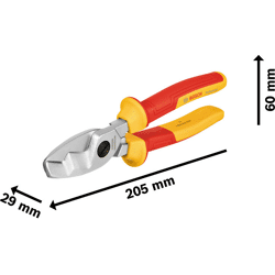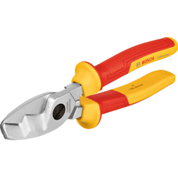Zange VDE-Kabelschere 200 mm, Professionelle Handwerker brauchen Werkzeuge, die leicht anzuwenden sind und allen gesetzlichen Vorgaben entsprechen. Mit der Bosch Professional VDE-Kabelschere lassen sich Kabel abmanteln und schneiden, selbst bei unerwartetem Kontakt mit stromführenden Teilen. Dieses normgerechte Werkzeug ist mit thermoplastischem Polyurethan (TPU) isoliert. Es wurde bis zu 10.000 Volt geprüft und bis 1.000 Volt VDE-zertifiziert gemäß DIN EN/IEC 60900. Die VDE-Kabelschere ist handlich und vielseitig. Dank ihrer Doppelklingentechnologie, kann die erste Klinge zum Abmanteln und die zweite zum Schneiden des Kabels verwendet werden. Diese langlebige Schere wurde aus Schmiedestahl gefertigt, und hat gehärtete Schneidekanten. Durch die Aufnahme von VDE-Handwerkzeugen in unser Bosch Professional-Sortiment sind nun alle erforderlichen Werkzeuge in zuverlässiger Bosch-Qualität erhältlich. Diese robuste Kabelschere eignet sich dank Doppelklingentechnologie zum Abmanteln von Kabeln und Schneiden von Aluminium und Weichkupfer, AWG 2/0 mit einem Querschnitt von bis zu 70 mm² und einem Außendurchmesser von 20 mm. Bequem in der Anwendung dank ergonomischem Softgrip. Hängeschild