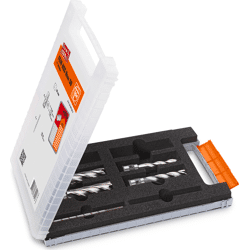 Hohe Standzeit. Metrische Abmessungen, Schnitttiefe 25 mm. Set-Ausführung, bestehend aus 4 Kernbohrern Ø 2x 14 mm, 2x 18 mm (Schnitttiefe 25 mm) sowie 1 Zentrierstift (80 mm) im Kunststoff-Koffer.
