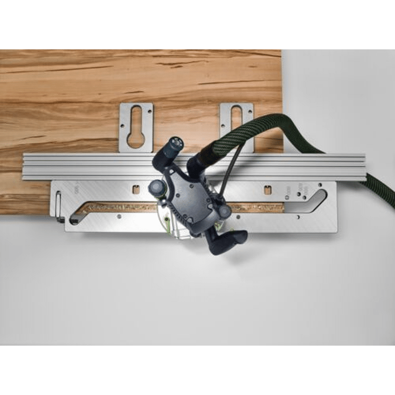 Zusätzlich mit zwei frei positionierbaren Frässchablonen zum Einlassen handelsüblicher Verbindungsbeschläge auf der Plattenunterseite