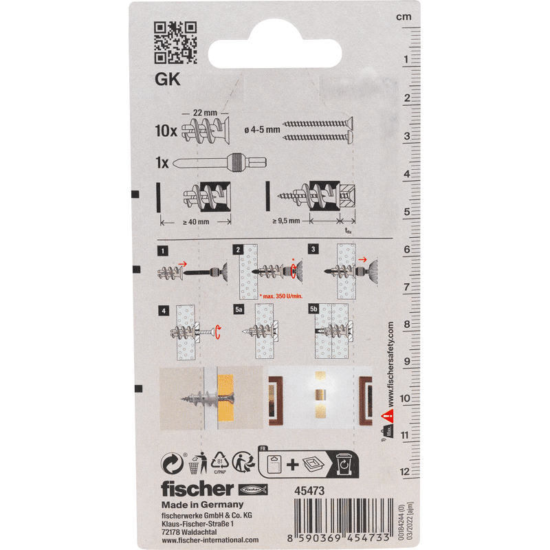 Der fischer Gipskartondübel GK ist aus hochwertigem Nylon gefertigt. Der Dübel wird in der Vorsteckmontage mit dem beigefügten Setzwerkzeug oberflächenbündig in einfach und doppelt beplankten Gipskarton eingedreht. Der spiralförmige Dübel hält durch Formschluss. Die kompakte Bauform ermöglicht auch die Montage in Wänden, bei denen die Plattendicke oder der Hohlraum hinter der Platte nicht bekannt ist. Der fischer GK kann Holz-, Blech- und Spanplattenschrauben von 4 bis 5 mm Stärke sowie unterschiedliche Haken und Ösen aufnehmen. Dadurch ist er universell geeignet, um z.B. Bilder, Leuchten und Elektroinstallationen sicher und schnell zu befestigen.