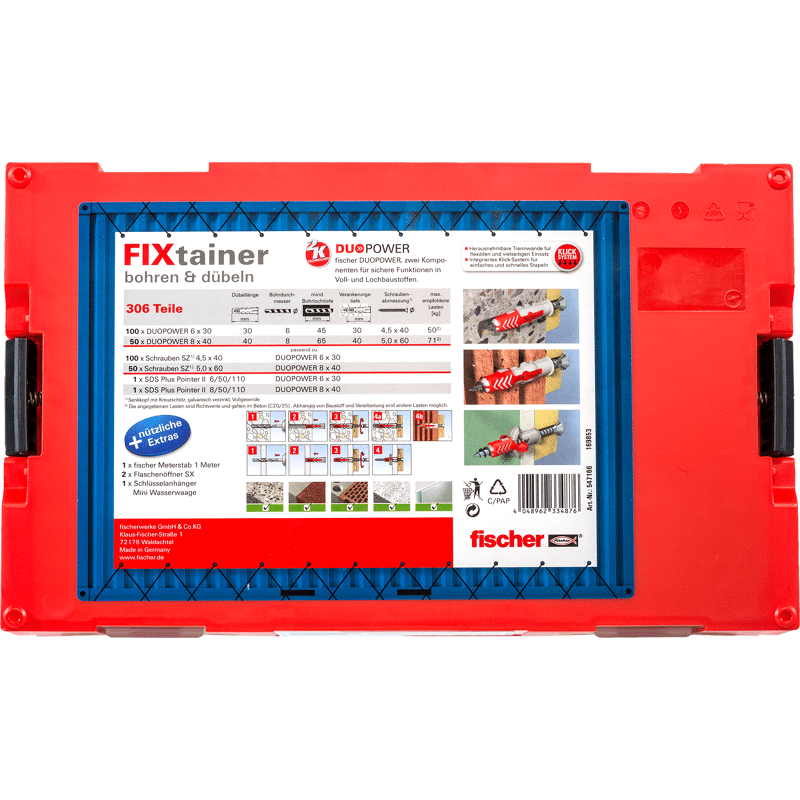 Der FixTainer bohren & dübeln enthält die neue Leistungsklasse - den fischer DuoPower vorsortiert in den Abmessungen 6 x 30 und 8 x 40. Dazu die passenden Schrauben und der jeweils passende Hammerbohrer SDS Plus Pointer II. Nützliche Extras wie einen fischer Meterstab 1 Meter, zwei Flaschenöffner SX und einen Schlüsselanhänger Mini Wasserwage runden das praktische Set ab.