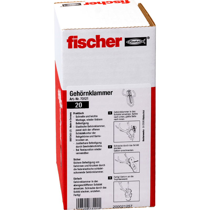 Die fischer Gehörnklammer dient zur einfachen und sicheren Befestigung Ihrer Trophäen. Die Gehörnklammer in den ebengeschliffenen Schädel einsetzen, Schraube durch das Schild stecken und festziehen. Die elastische Gehörnklammer passt sich der offenen Schädelkontur der Rehgehörne und Gamskrucken an. Die Befestigung kann bei Bedarf einfach demontiert werden. Durch die Gewindelochreihe bietet die Gehörnklammer eine flexible Justage.