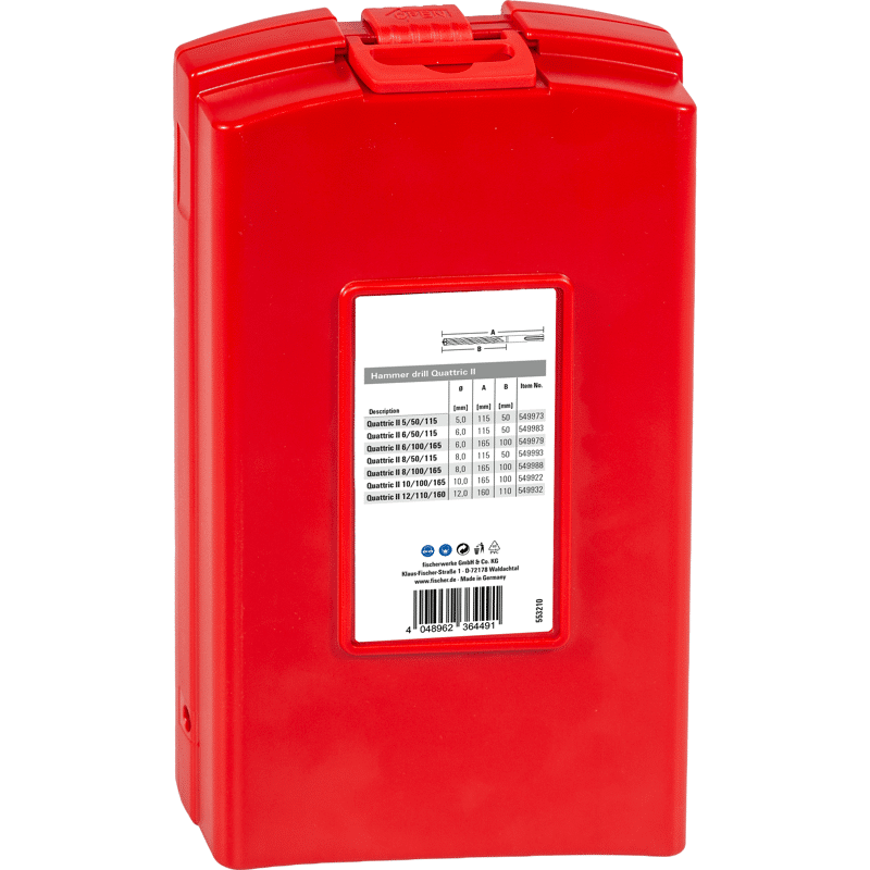 Der fischer Hammerbohrer Quattric II ist ein Hochleistungsbohrer mit SDS-Plus-Aufnahme. Der Hartmetallkopf und das neue zweiteilige Wendel Design ermöglichen ein schnelleres Bohren und erhöhen die Standzeit. Seine Armierungsphasen verhindern das Einhaken in Armierungen. Der Bohrer ist perfekt geeignet für zulassungskonforme Bohrlöcher gemäß PGM.