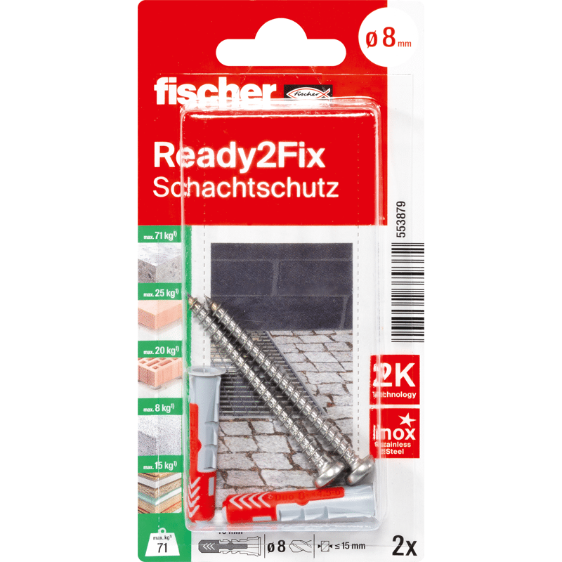Das fischer Montageset Einbruchsicherung Lichtschacht B beinhaltet alle Elemente zur sicheren Befestigung von Lichtschacht Einbruchsicherungen: 2 fischer DuoPower 8 x 40, 2 A2-Edelstahl Spanplattenschrauben mit Panhead 5,0 x 60.