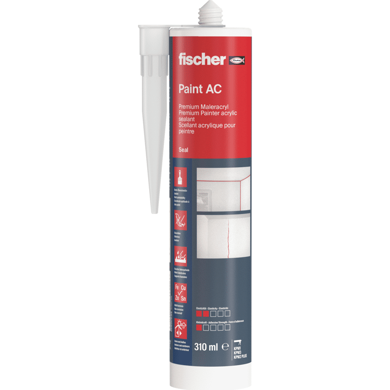 fischer Maleracryl Premium DMA eignet sich beispielsweise für die Verarbeitung in Beton, Gips, Holz, Mauerwerk und Metall. Mit dem Dichtstoff werden Anschlussfugen im Innenbereich zwischen Holz-, Kunststoff- und Metallfenstern und Wand abgedichtet. Auch Fugen im Trocken- und Innenausbau, zwischen Treppe und Wand, Decke und Wand werden mit dem fischer Maleracryl Premium DMA geschlossen. Der Dichtstoff wirkt nicht korrosiv und bietet sehr gute Witterungs-, Alterungs- und UV-Beständigkeit. Er kann bei Temperaturen von +5 °C bis +40 °C verarbeitet werden und ist temperaturbeständig von -20 °C bis +75 °C.