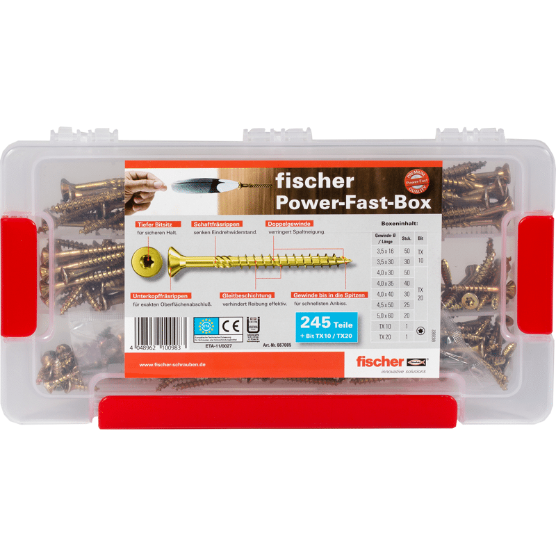 Die fischer PowerFast Sortimentsbox FAB FPF-ST YZ 245 P beinhaltet 245 PowerFast Schrauben von ø 3,5 bis ø 5, 1 bit TX 10, 1 Bit TX 20. Das einzigartige PowerFast Gewinde reicht bis in die Schraubenspitze und sorgt für einen schnellen Anbiss. Dies erleichtert die Verarbeitung in allen Holzbaustoffen spürbar. Die optimierte Kopfgeometrie ermöglicht auch bei randnahen Verschraubungen einen exakten und splitterfreien Oberflächenabschluss ohne Abreißen der Schraube. Die fischer PowerFast Schrauben sind geeignet für die Befestigung von beispielsweise Sockelleisten, Tür- und Metallbeschlägen, allgemeinen Holzverbindungen sowie für zulassungsrelevanten Anwendungen.