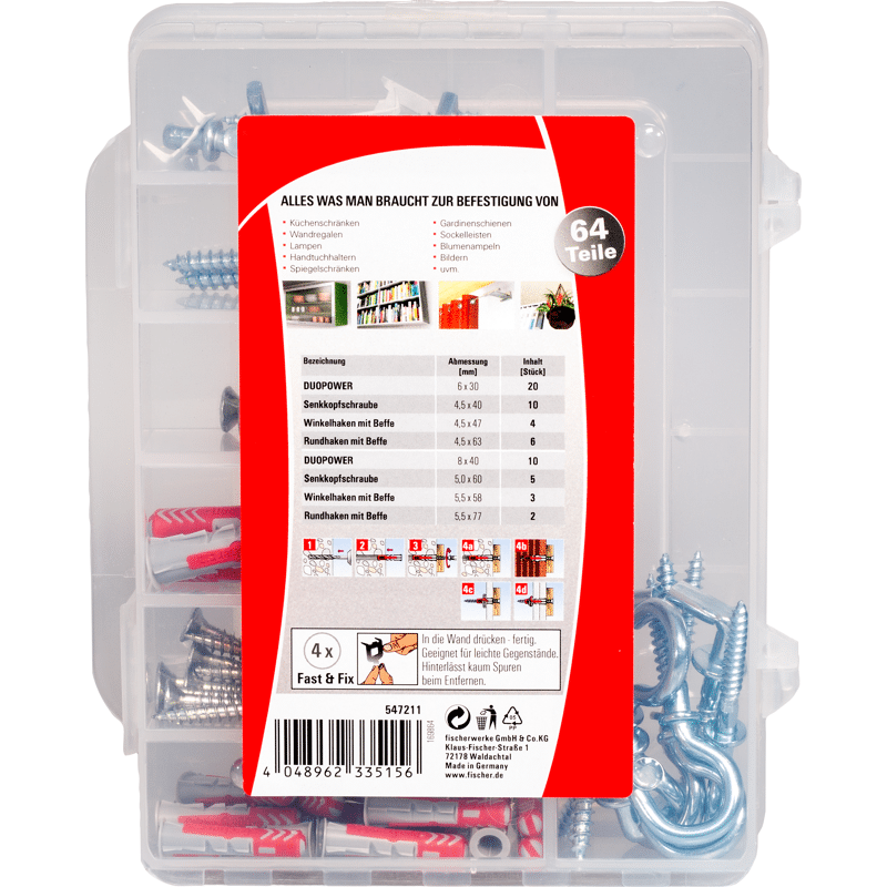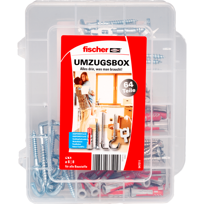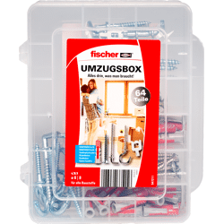 Für alle, die gerade mitten im Umzug stecken oder renovieren! Die Umzugsbox enthält den fischer 2-Komponenten-Dübel DuoPower, dem Duo aus Power und Schlauer, mit sicherem Halt in allen Baustoffen. Im Durchmesser 6 und 8, mit passenden Schrauben und Haken zusammen 64 Teile. Der DuoPower ist die erste Wahl bei der Befestigung von Wandregalen, Spiegelschränken und Co.