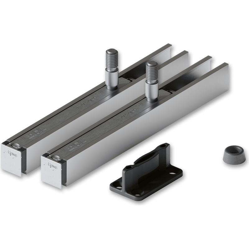 Beschlag mit minimaler Einbauhöhe für oben laufende Holztüren bis 100 kg, mit aufgesetzter oder deckenbündiger Laufschiene. Optional mit Dämpfeinzug. Wand- oder Deckenmontage.