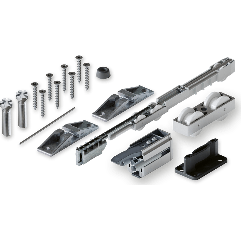 Beschlag für oben laufende Holztüren bis 100 kg, mit aufgesetzter Laufschiene. Optional mit Dämpfeinzug. Wand-, Pocket oder Deckenmontage.
