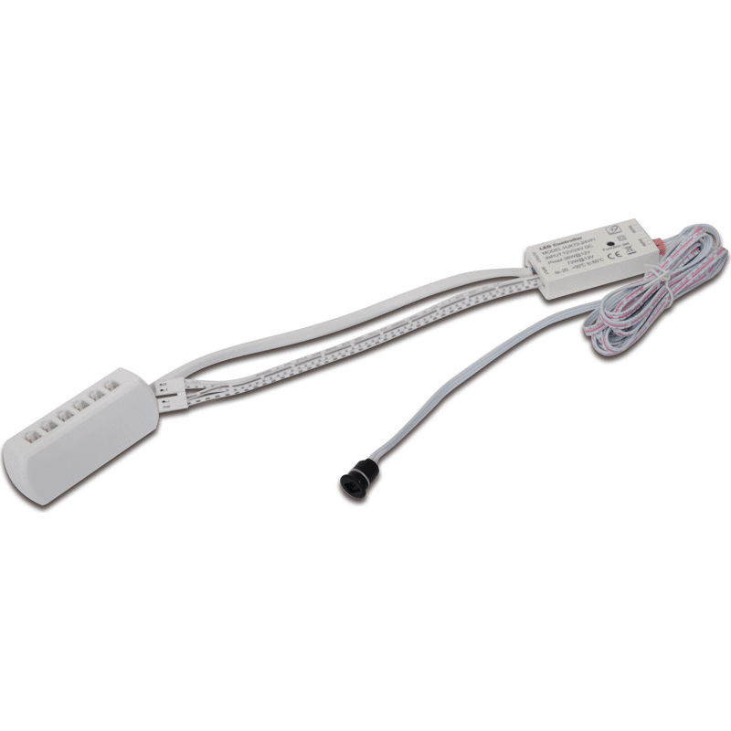 Berührungsloser IR-Schalter zum Anschluss von LED-Leuchten mit 24V, Anschlussleitung 0,2m mit LED 24-Stecker, Schaltleitung 0,2m mit 12-fach Verteiler, Sensorleitung 2m, zur Montage in 10mm Bohrungen, am Schalter kann zwischen folgenden beiden Funktionen gewählt werden: Funktion 1 (Lieferzustand): Lichteinschaltung mit erster Bewegung, -ausschaltung mit folgender, Funktion 2: Beim Öffnen der Tür schaltet sich das Licht ein und beim Schließen der Tür wieder aus, bei 2 Sensoren geht das Licht an, sobald eine Tür geöffnet wird