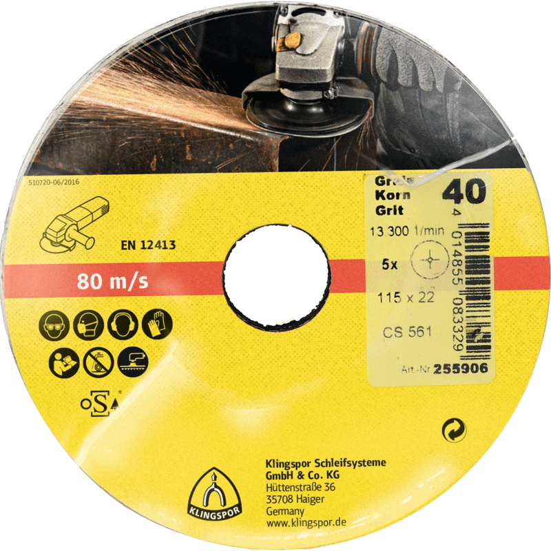 Die Fiberscheiben CS 561 werden auf handelsüblichen Winkelschleifern eingesetzt. Ihre hohe Abtragsleistung und ihre lange Standzeit verdanken die Scheiben dem harten Korund-Schleifkorn und der festen Kunstharz-Bindung. Klingspor bietet die CS 561 in einer sehr großen Auswahl an Durchmessern, Korngrößen und Lochformen an. Dementsprechend ist die Fiberscheibe universell einsetzbar: im Bereich Metall für grobe Entgratungsarbeiten und Schweißnahtbearbeitungen ebenso wie für das Entrosten und den Feinschliff. In gröberen Körnungen ist CS 561 auch für Holz und Kunststoff geeignet. Das Schliffbild wird durch den gewählten Stützteller beeinflusst – der flexible ST 358 erzielt ein gleichmäßiges Schliffbild, der harte, gerippte ST 358 A ist eher für grobe Schleifarbeiten und hohen Abtrag geeignet.