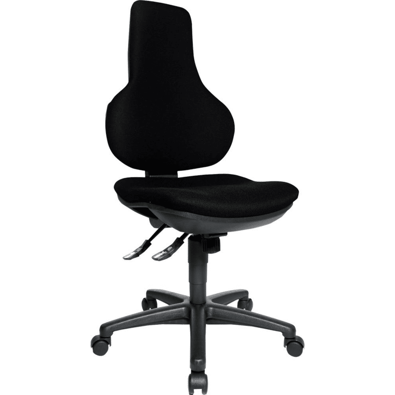 Rückenlehne: konturgeformt, mit Wirbelsäulen-Ausformung und Lendenwirbelstütze, taillierte Rückenlehnenform für größtmögliche Armfreiheit, über Rastermechanik höhenverstellbar