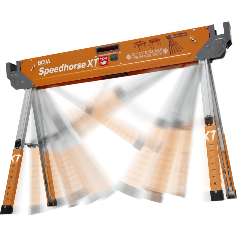 • Der höhenverstellbare Arbeitsbock Bora Portamate PM-4550 Speedhorse™ ist das ultimative Upgrade für Ihre Baustelle, Ihren Arbeitsbereich oder Ihre Werkstatt. Sparen Sie wertvolle Zeit beim Auf- und Abbau, dann können Sie mit der Arbeit schneller beginnen und Aufträge effizienter erledigen. Speedhorse™ lässt sich 30-mal schneller einsetzen als herkömmliche Arbeitsböcke – ziehen Sie einfach am Entriegelungsknopf in der Mitte des Rahmens.
